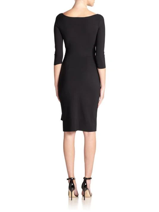- Knee-length sheath dress infour-way stretch fabrication andunique wrinkle-resistant textile