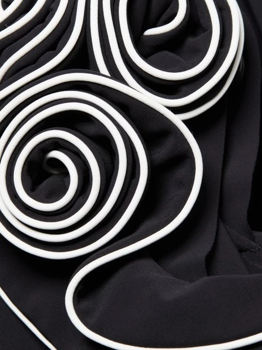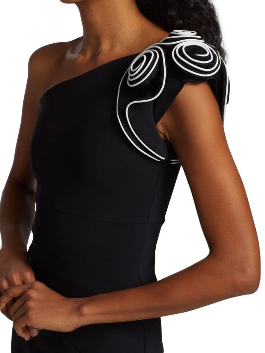 ONLY AT SAKS IN BLACK. This charming mermaid gown flows elegantly from a one-shoulder neckline, adorned with rosette appliqué with striking contrasting piping.