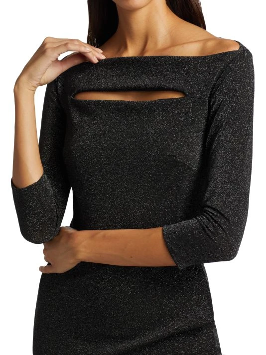 This minidress is made of metallic fabric with a ruched skirt and cut-out detail along the neckline.