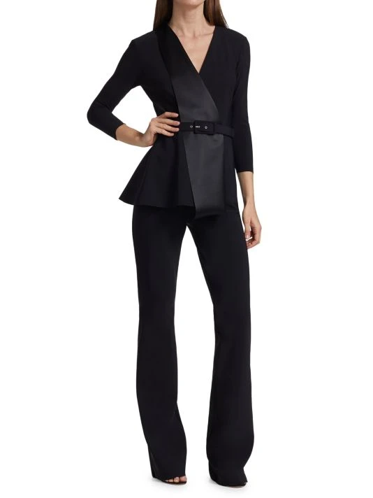 Pullover stretch jersey jumpsuit with a tailored jacket bodice and elongating silhouette.