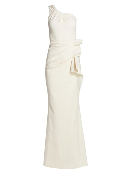 ONLY AT SAKS. Cut in a dramatic silhouette, this asymmetric gown has a single knotted shoulder strap and ruching at the hip to highlight the curve of your waist.