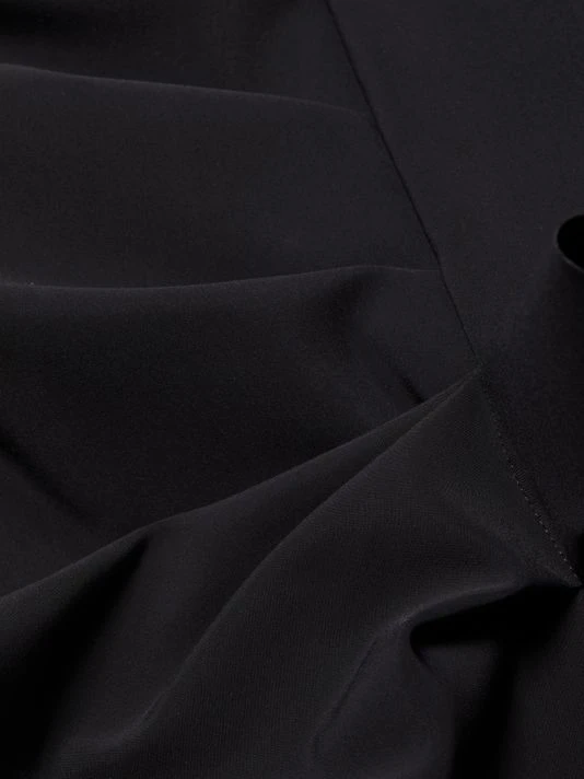 Cut in a formfitting silhouette, this knee-length wrap dress is complete with an off-the-shoulder neckline and draped three-dimensional side.