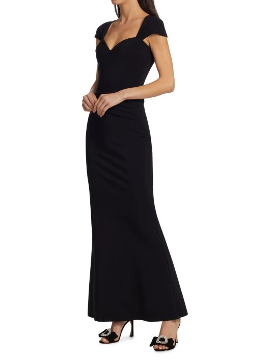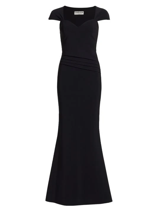 This fitted jersey gown is accented with an elegant sweetheart neckline and cap sleeves.