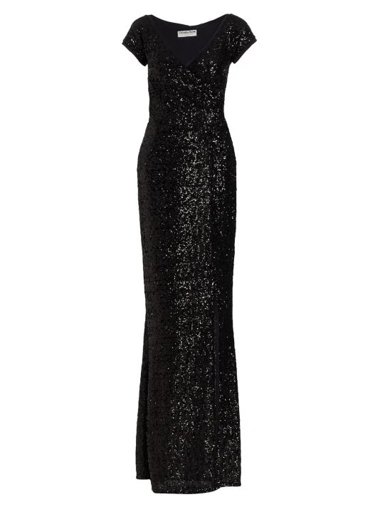 ONLY AT SAKS. Shimmering with sequins, this sophisticated gown features surplice V-neck and cap sleeves, cut with a side slit creating a dynamic movement with floor-length hem.